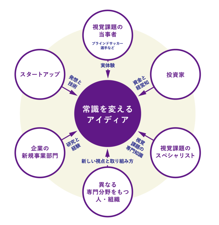 視覚課題*当事者にとってより良い未来をつくり出すために、視覚障がい者、ブラインドサッカー競技団体、視覚障がい者支援団体などの当事者と、大企業、スタートアップ、投資家、研究者、テクノロジー開発者など多彩なステークホルダーが参画し、製品やサービス、解決策を共同で生み出すことを目指しています。